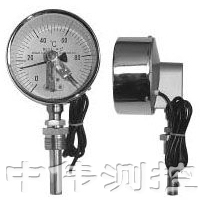 电接点远传双金属温度计带有电接触装置一即机械电接点。当被测介质温度变化时,自由端上的细轴及转向传动机构带动指针及动触点转动,在标度盘上指示出温度的变化值,当其与定触点(上、下限定触点)接触或断开时的瞬时,使电路系统中的继电器及接触器动作,以达到自动控制和报警目的。
